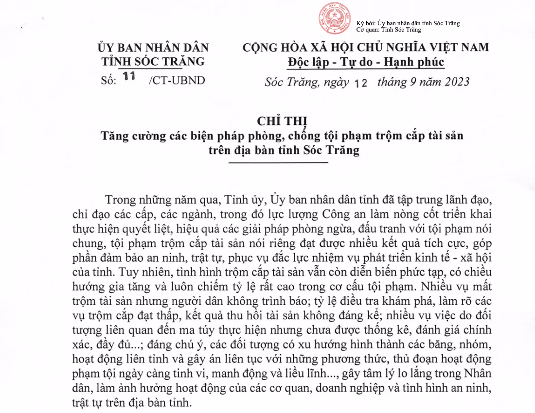 Ngày 14/9, ông Trần Văn Lâu - Chủ tịch UBND tỉnh Sóc Trăng cho biết vừa ban hành Chỉ thị “Tăng cường các biện pháp phòng, chống tội phạm trộm cắp tài sản trên địa bàn tỉnh Sóc Trăng”.
