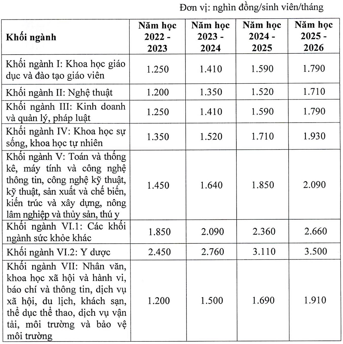 Với các khối ngành đào tạo trình độ đại học tại các trường công lập chưa tự bảo đảm chi thường xuyên và chi đầu tư được chia thành 7 khối ngành tương ứng với từng mức học phí.