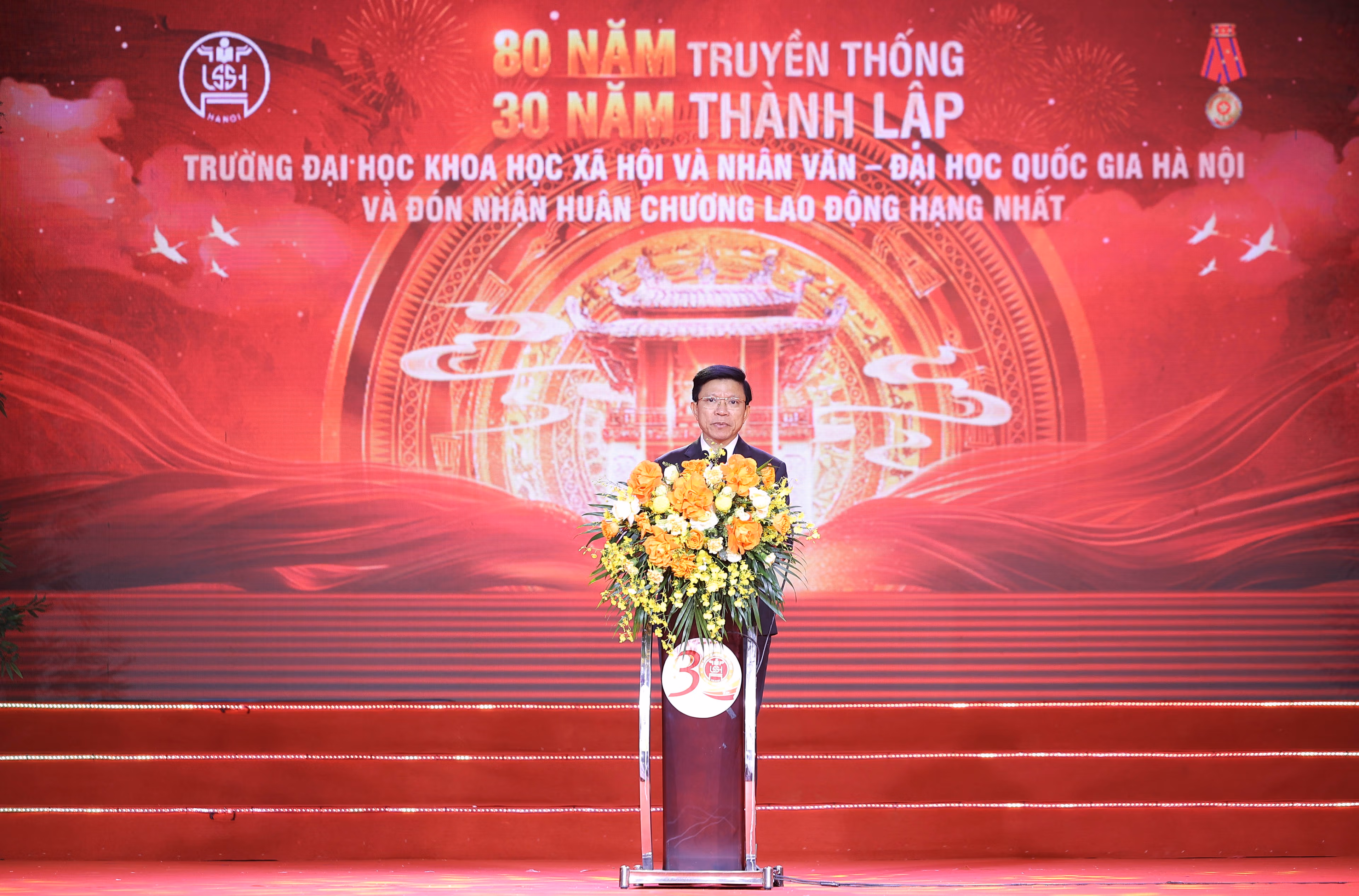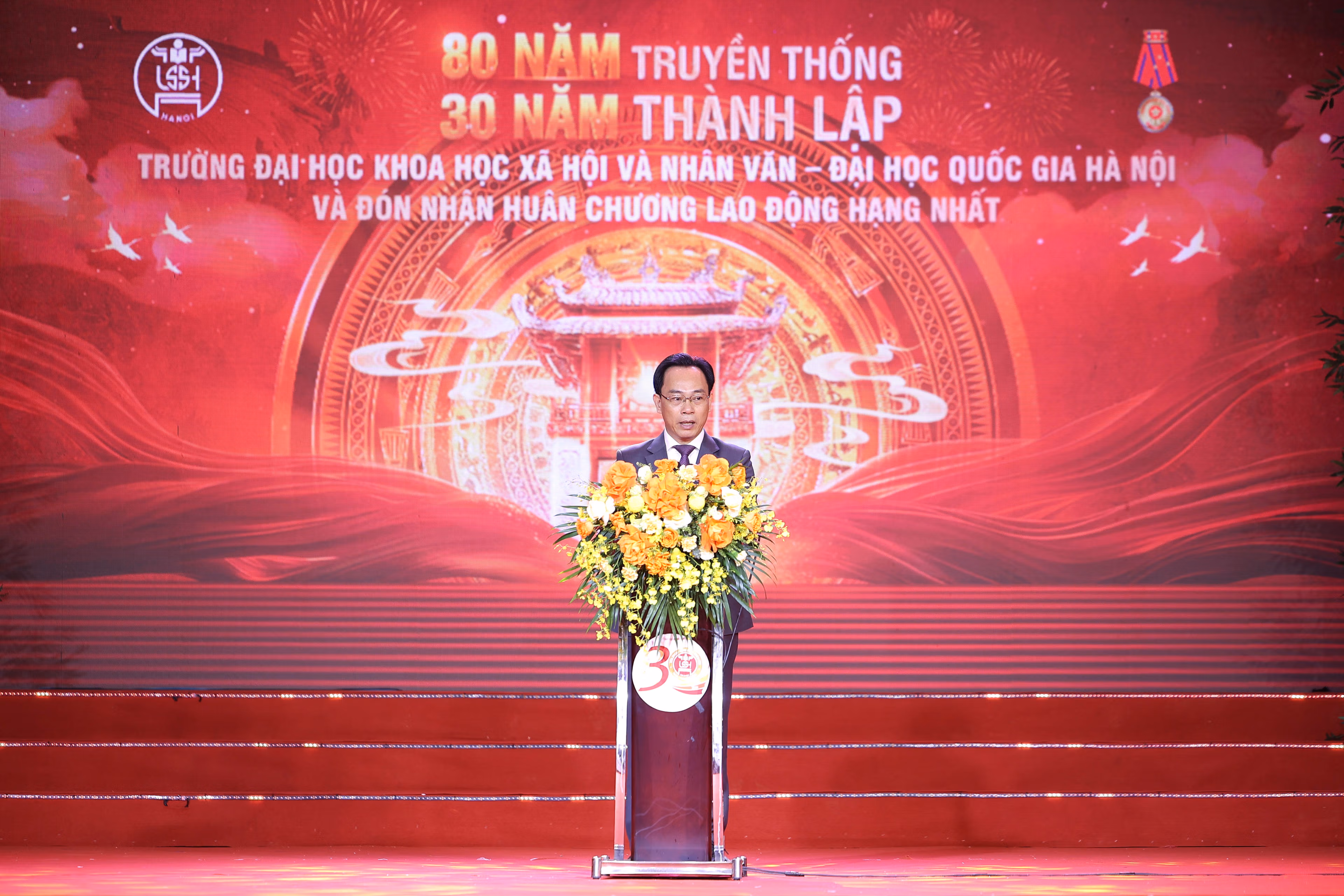Phát biểu tại buổi lễ, Phó Thủ tướng Lê Thành Long gửi tới các thế hệ thầy giáo, cô giáo, cán bộ, viên chức, người lao động và học sinh, sinh viên Nhà trường lời chúc mừng nồng nhiệt nhất. Trường Đại học Khoa học Xã hội và Nhân văn là một cơ sở giáo dục đại học có lịch sử lâu đời; nơi khai sinh nhiều ngành khoa học xã hội và nhân văn hiện đại của Việt Nam, tạo tiền đề cho các ngành khác phát triển, từng bước khẳng định vị thế trong đời sống học thuật trong nước, ở khu vực và trên thế giới.