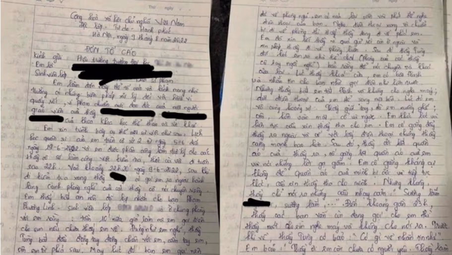 Đơn thư viết: “Lịch học quân sự của em bắt đầu từ ngày 5/6 đến 19/6/2022. Vào ngày 9/6, thầy T. đã gọi em ra ngoài hành lang để nói chuyện riêng rồi bắt đầu "động tay động chân, cầm tay, ôm từ phía sau…”.