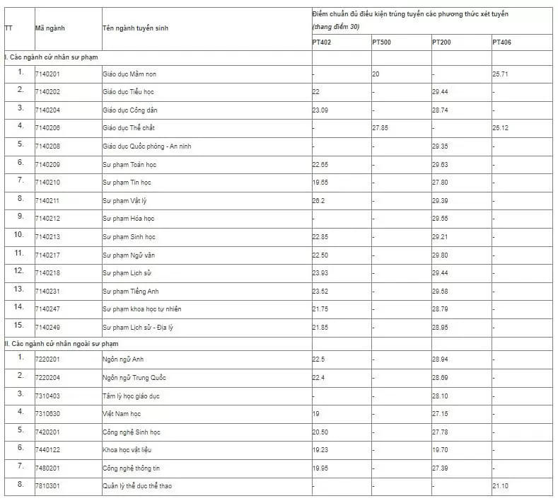 Đối với phương thức sử dụng kết quả học tập cấp trung học phổ thông (học bạ): Ngành lấy điểm chuẩn cao nhất là ngành Sư phạm Ngữ văn (29,80 điểm). Tiếp theo là ngành Sư phạm Toán học (29,3 điểm), Sư phạm Tiếng Anh (29,58 điểm). Ngành có điểm chuẩn thấp nhất theo phương thức xét tuyển này là Khoa học vật liệu (19,70 điểm).