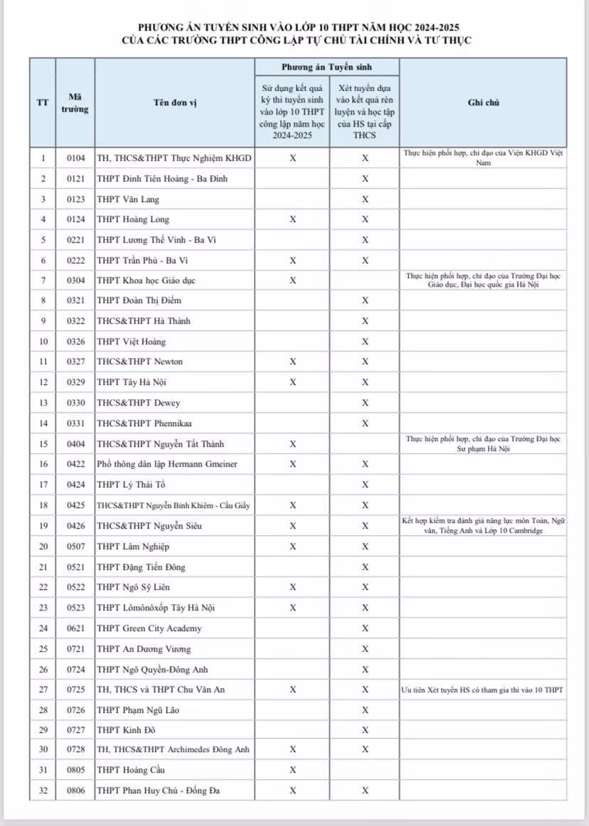 Dưới đây là danh sách các trường THPT tư thục và trường công lập tự chủ tài chính có tuyển sinh học sinh lớp 10 theo phương thức sử dụng kết quả kỳ thi tuyển sinh lớp 10 trường công lập.