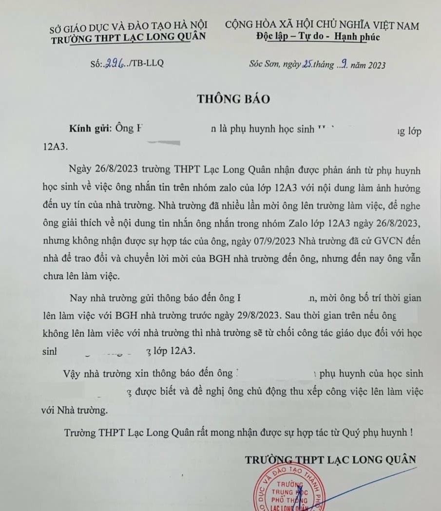 Vì vậy, Trường THPT Lạc Long Quân tiếp tục gửi thông báo tới phụ huynh với nội dung: “Sau thời gian trên, nếu ông không lên làm việc, nhà trường sẽ từ chối công tác giáo dục đối với học sinh”.