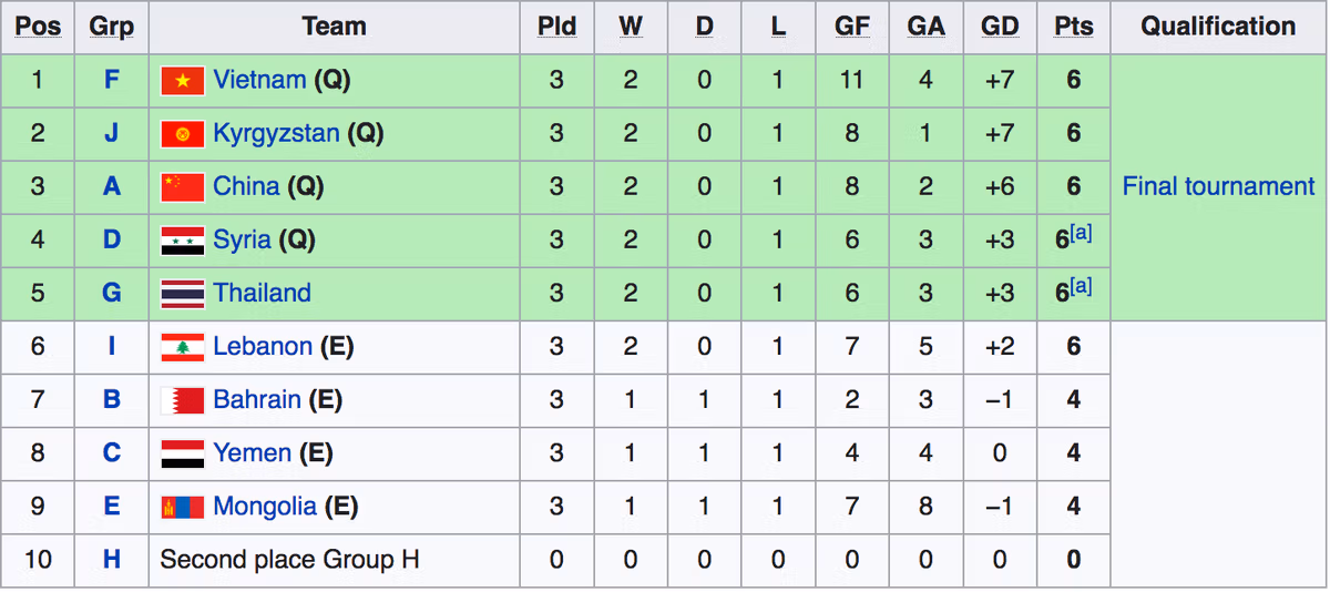 Sau khi kết thúc lượt trận cuối cùng vòng loại châu Á, U20 Việt Nam cùng với Kyrgyzstan, Trung Quốc, Syria giành vé dự giải châu Á.