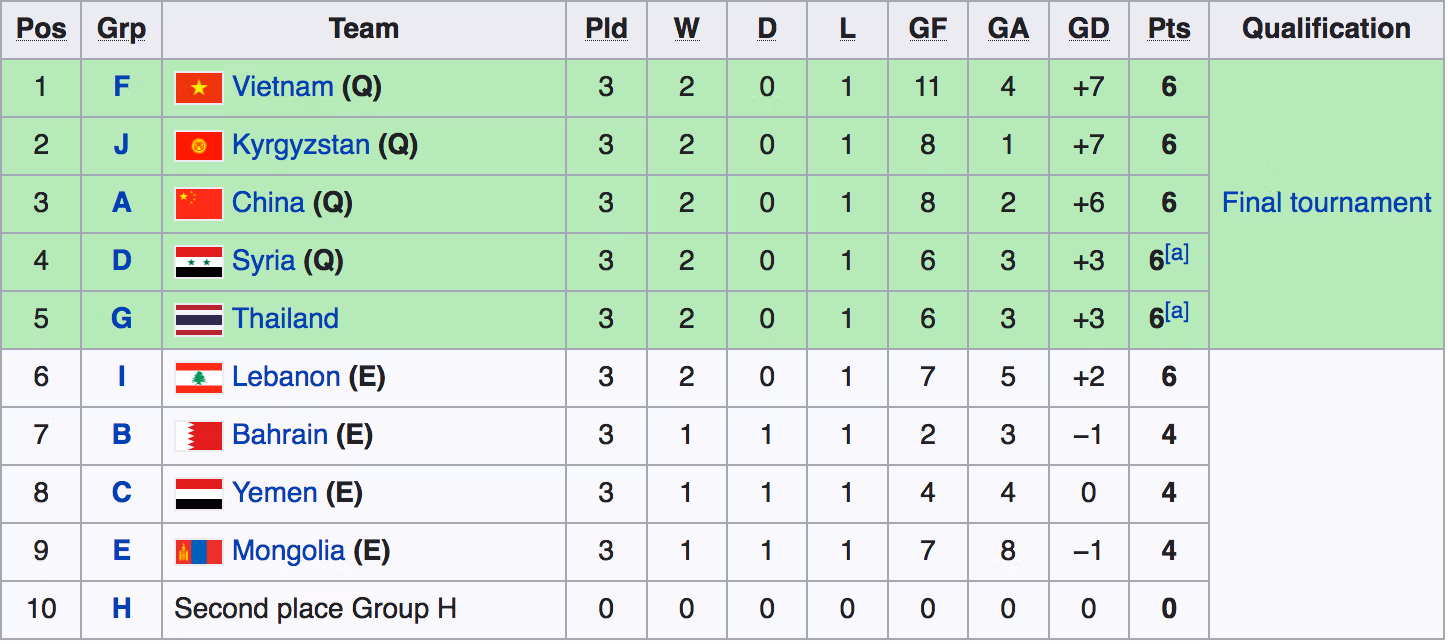 Sau khi kết thúc lượt trận cuối cùng vòng loại châu Á, U20 Việt Nam cùng với Kyrgyzstan, Trung Quốc, Syria giành vé dự giải châu Á. Suất là còn lại cuộc đua của đội nhì bảng đang xếp thứ 5 là U20 Thái Lan và đội nhì bảng H (diễn ra vào tháng 10 với sự tham gia của 4 đội bóng Australia, Iraq, Kuwait và Ấn Độ).