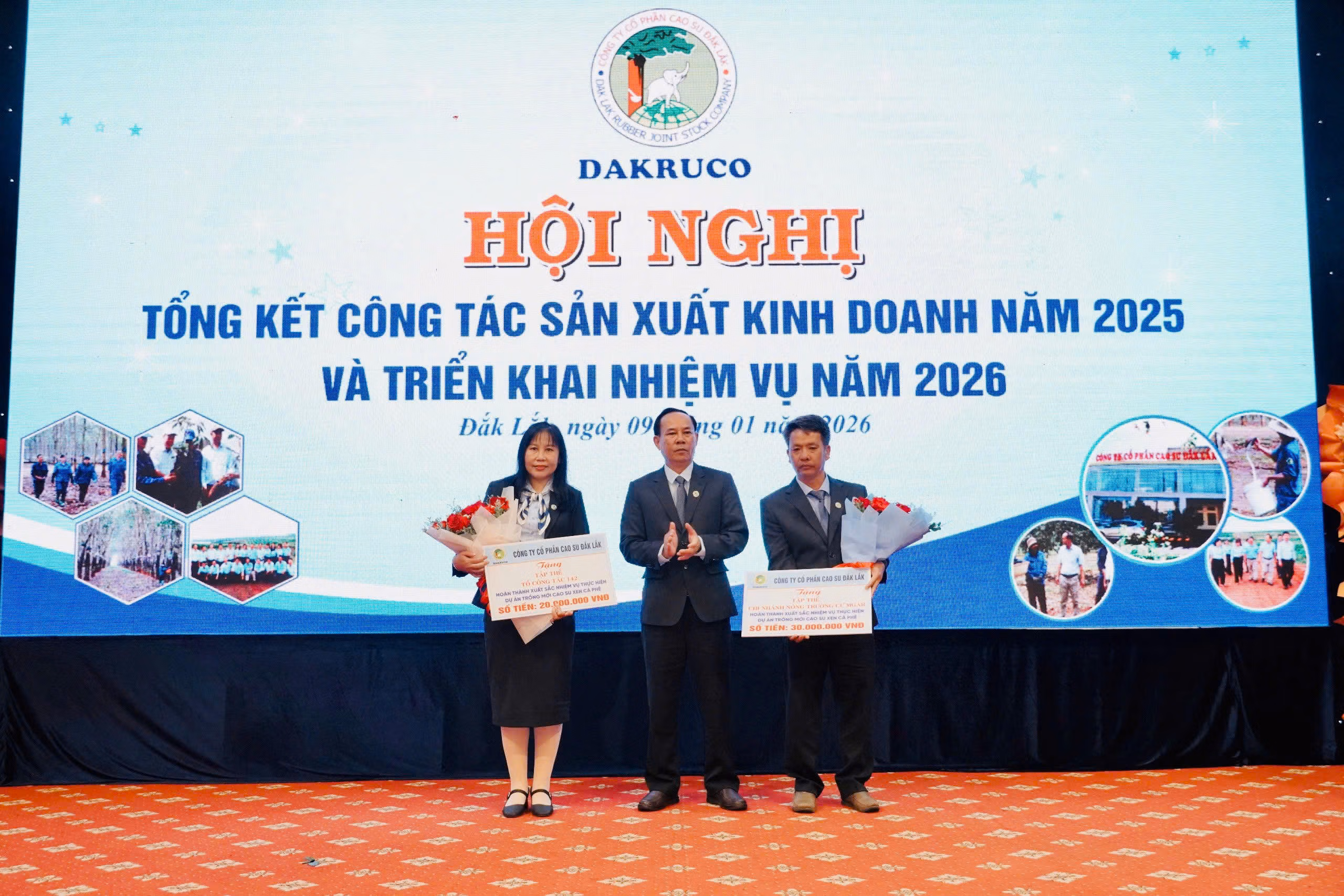 Vượt khó, hoàn thành vượt mức nhiều chỉ tiêu quan trọng tại Hội nghị tổng kết công tác sản xuất kinh doanh năm 2025 và triển khai nhiệm vụ năm 2026 diễn ra ngày 9/1, DAKRUCO ghi nhận nhiều kết quả nổi bật. Sản lượng khai thác mủ cao su toàn Công ty đạt khoảng 8.572 tấn, vượt 112% kế hoạch, tăng gần 20% so với năm 2024. Tổng doanh thu ước đạt 705,61 tỷ đồng, lợi nhuận trước thuế đạt 88,41 tỷ đồng, tăng mạnh 75,8% so với cùng kỳ.