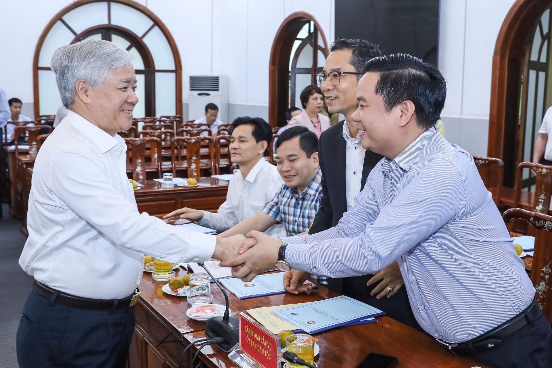 Chủ trì Hội nghị có ông Đỗ Văn Chiến, Bí thư Trung ương Đảng, Chủ tịch UBTƯ MTTQ Việt Nam; ông Hầu A Lềnh, Ủy viên Trung ương Đảng, Bộ trưởng, Chủ nhiệm Ủy ban Dân tộc; bà Nguyễn Thị Thu Hà, Ủy viên Trung ương Đảng, Phó Chủ tịch - Tổng Thư ký UBTƯ MTTQ Việt Nam; ông Y Vinh Tơr, Ủy viên dự khuyết Trung ương Đảng, Thứ trưởng, Phó Chủ nhiệm Ủy ban Dân tộc.