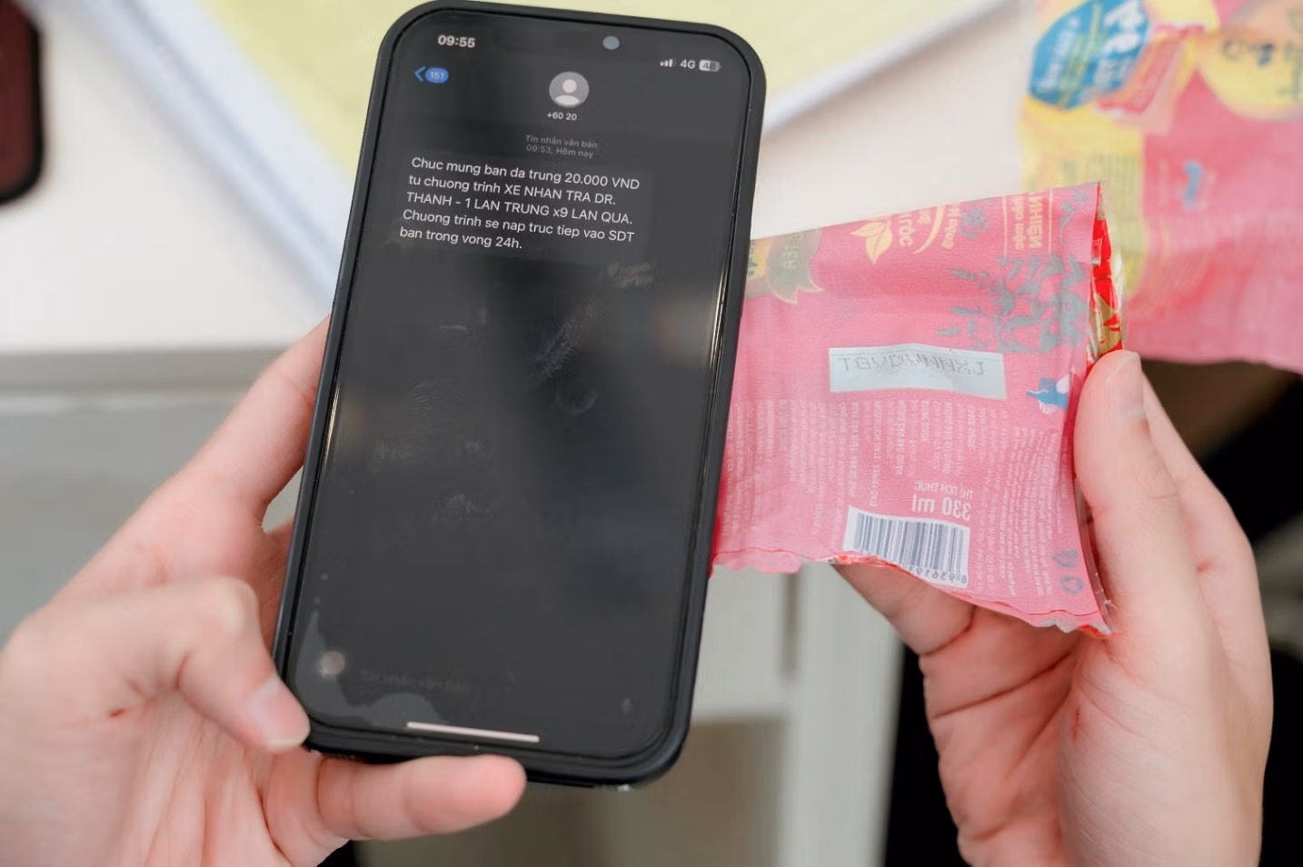 Nữ giáo viên mầm non cho biết thêm, hơn nửa tháng trước, chị mua Trà Dr Thanh uống như thường lệ thì thấy chủ quán đưa cho chai sản phẩm có thông tin chương trình khuyến mãi, vừa uống chị vừa xé nhãn lấy mã code nhắn tin tham gia chương trình cho vui nhưng không trúng thẻ cào điện thoại.