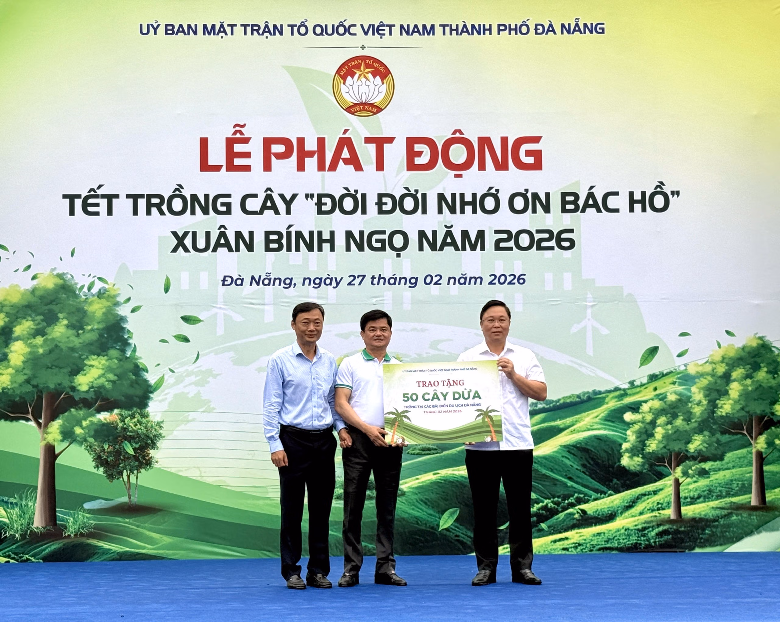 Tại chương trình, Ủy ban Mặt trận Tổ quốc Việt Nam thành phố trao tặng 50 cây dừa cho phường Ngũ Hành Sơn và Ban quản lý bán đảo Sơn Trà và các bãi biển du lịch Đà Nẵng, chung tay bảo vệ môi trường bền vững, xây dựng mảng xanh đô thị, nhất là cảnh quan khu vực biển đồng thời lan tỏa tinh thần trách nhiệm vì cộng đồng.