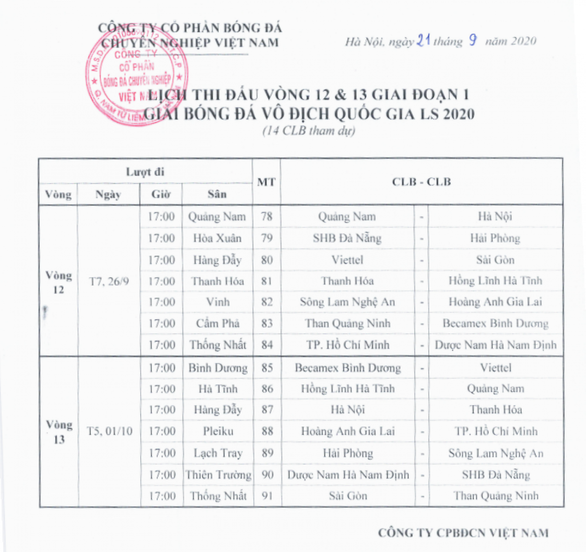 Theo đó, vòng 12 V-League 2020 sẽ diễn ra vào ngày 26/9. Trận đấu cuối cùng của giai đoạn lượt đi mùa giải năm nay diễn ra vào 1/10. Các trận đấu của hai vòng đấu này diễn ra đồng loạt vào lúc 17h.