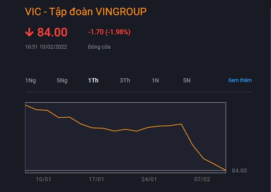 VIC chốt phiên giao dịch ngày 10/2/2022 bốc hơi tiếp 1,98 % giá trị và chỉ trong 4 phiên đầu tháng 2 đã giảm hơn 13%. VIC đã tụt về đáy thấp nhất 12 tháng. Mức giá này tương đương vùng giá cuối tháng 1/2021 của VIC.