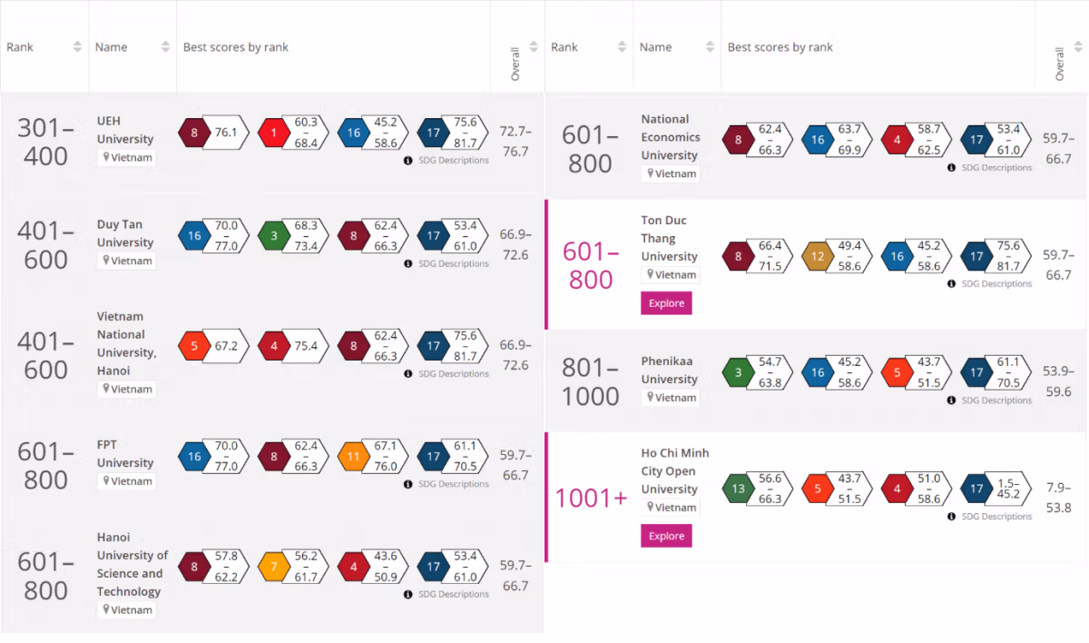 Tiếp đó, Đại học Quốc gia Hà Nội và Trường Đại học Duy Tân được xếp ở vị trí 401-600; Trường Đại học Tôn Đức Thắng, Đại học Bách khoa Hà Nội, Trường Đại học Kinh tế quốc dân, Trường Đại học FPT cùng được xếp ở vị trí 601-800; Trường Đại học Phenikaa được xếp ở vị trí 801-1000.