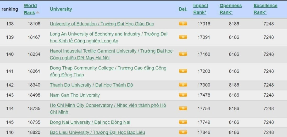 Việt Nam có 188 cơ sở giáo dục đại học được xếp hạng trong phiên bản tháng 7/2023, thêm 2 cơ sở mới so với phiên bản tháng 1/2023.