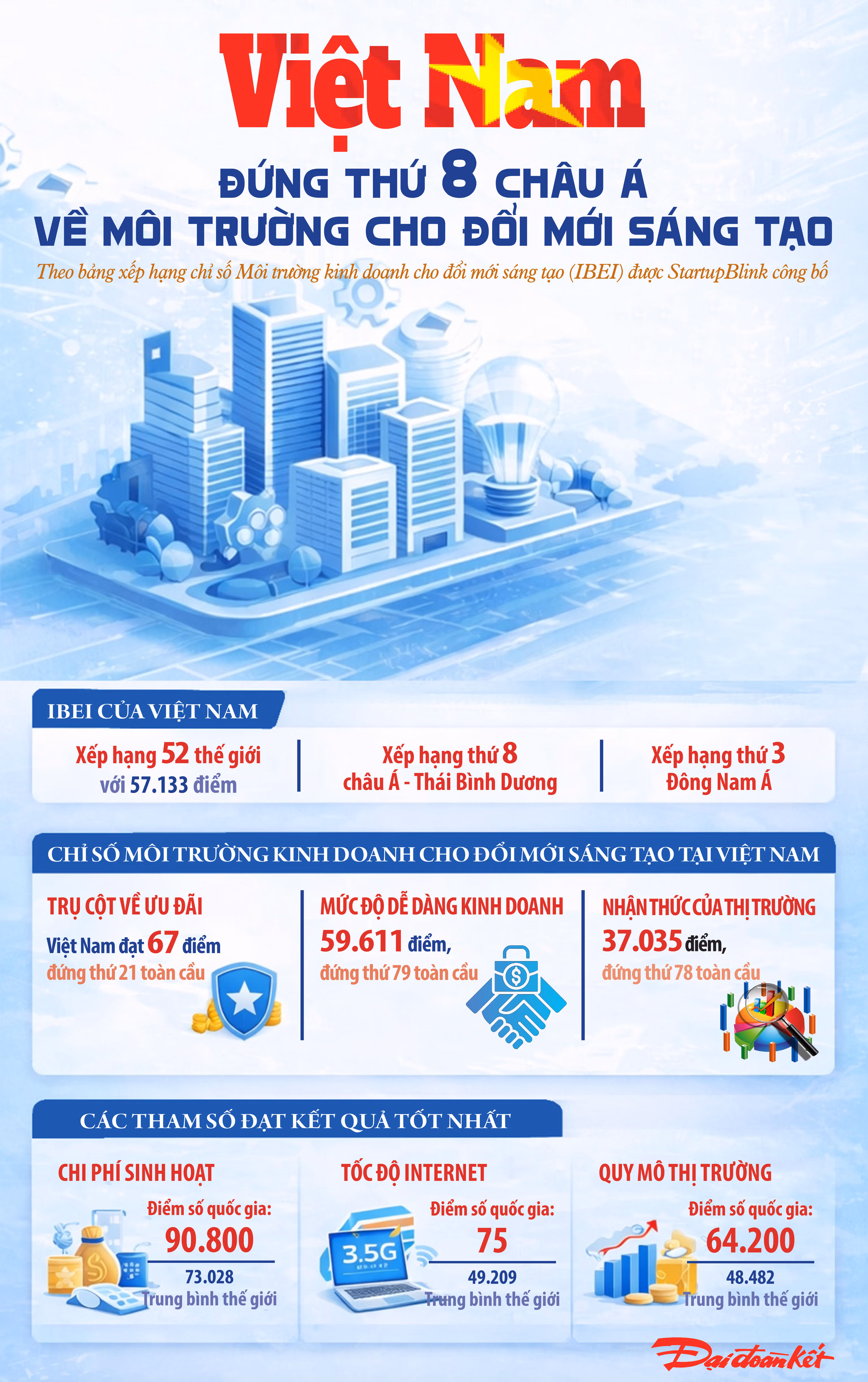 Theo bảng xếp hạng chỉ số Môi trường kinh doanh cho đổi mới sáng tạo (IBEI) được StartupBlink công bố tuần này, Việt Nam đạt 57,133 điểm, đứng thứ 52 trên toàn cầu, thứ 8 trong khu vực châu Á.