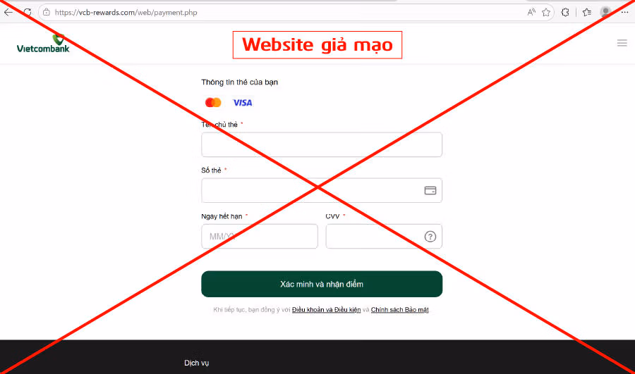 - Khi truy cập vào đường link này, người dùng sẽ bị dẫn tới trang chủ web giả mạo Vietcombank và bị yêu cầu cung cấp các thông tin bảo mật như: số điện thoại, tên chủ thẻ, số thẻ, ngày hết hạn và mã CVV dưới vỏ bọc "xác minh nhận điểm".