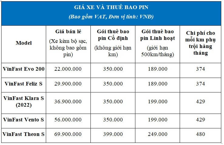 Mức giá bán lẻ và các gói thuê bao pin dành cho 5 dòng xe máy điện VinFast sử dụng pin LFP cụ thể như sau: