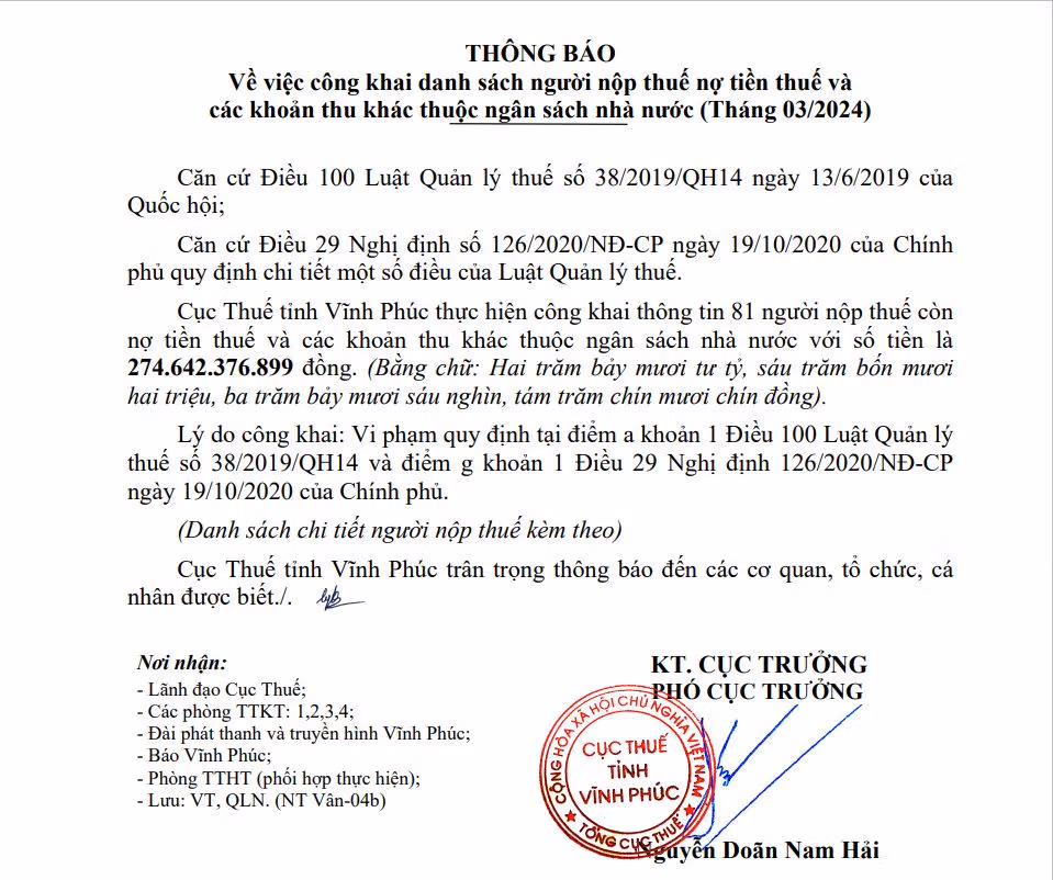 Cục Thuế tỉnh Vĩnh Phúc vừa thực hiện công khai thông tin 81 người nộp thuế còn nợ tiền thuế và các khoản thu khác thuộc ngân sách Nhà nước với số tiền là 274 tỷ 642 triệu đồng (tháng 03/2024).