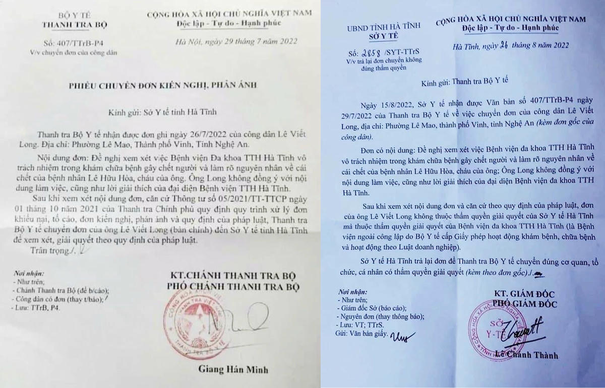 Sau khi nhận được kiến nghị của công dân liên quan đến việc người nhà bệnh nhân yêu cầu làm rõ nguyên nhân tử vong bất thường tại Bệnh viện Đa khoa TTH, Thanh tra Bộ Y tế đã chuyển đơn cho Sở Y tế Hà Tĩnh, tuy nhiên, đơn vị này đã trả lại đơn.
