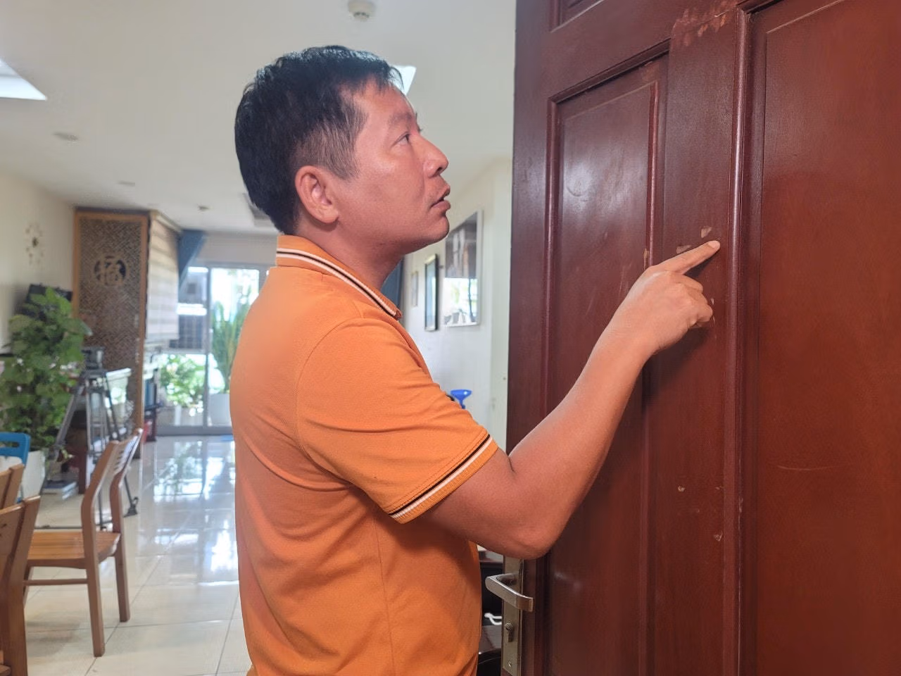 Ngày 24/4/2022, ông H. cầm theo hung khí dao nhọn, búa sang đập cửa chửi bới, có những lời lẽ doạ giết gia đình anh. Sự việc được camera giám sát ghi lại toàn bộ. “Các vết đập vẫn còn ở trên cửa”, anh L. nói.