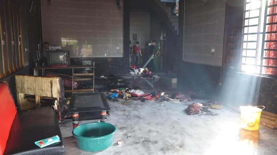 4 mẹ con chị Hiên nằm bất tỉnh dưới nền xi măng trong tình trạng bỏng nặng, xung quanh phòng mùi xăng bốc lên nồng nặc. Bên trong ngôi nhà cháy đen kịt, nhiều vật dụng hư hỏng.