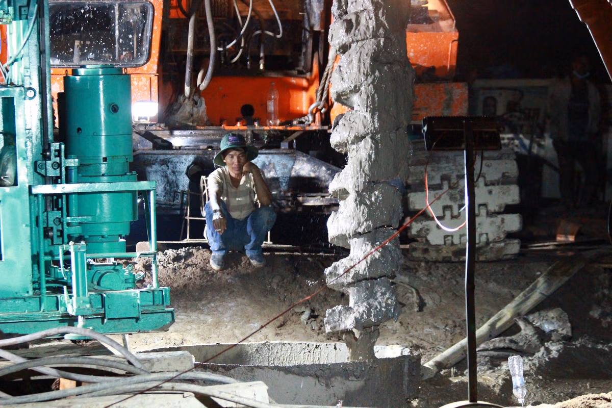 [Mũi khoan đã khoan xuống độ sâu 34 - 35 m ngang với đáy cọc mà em bé bị tai nạn]