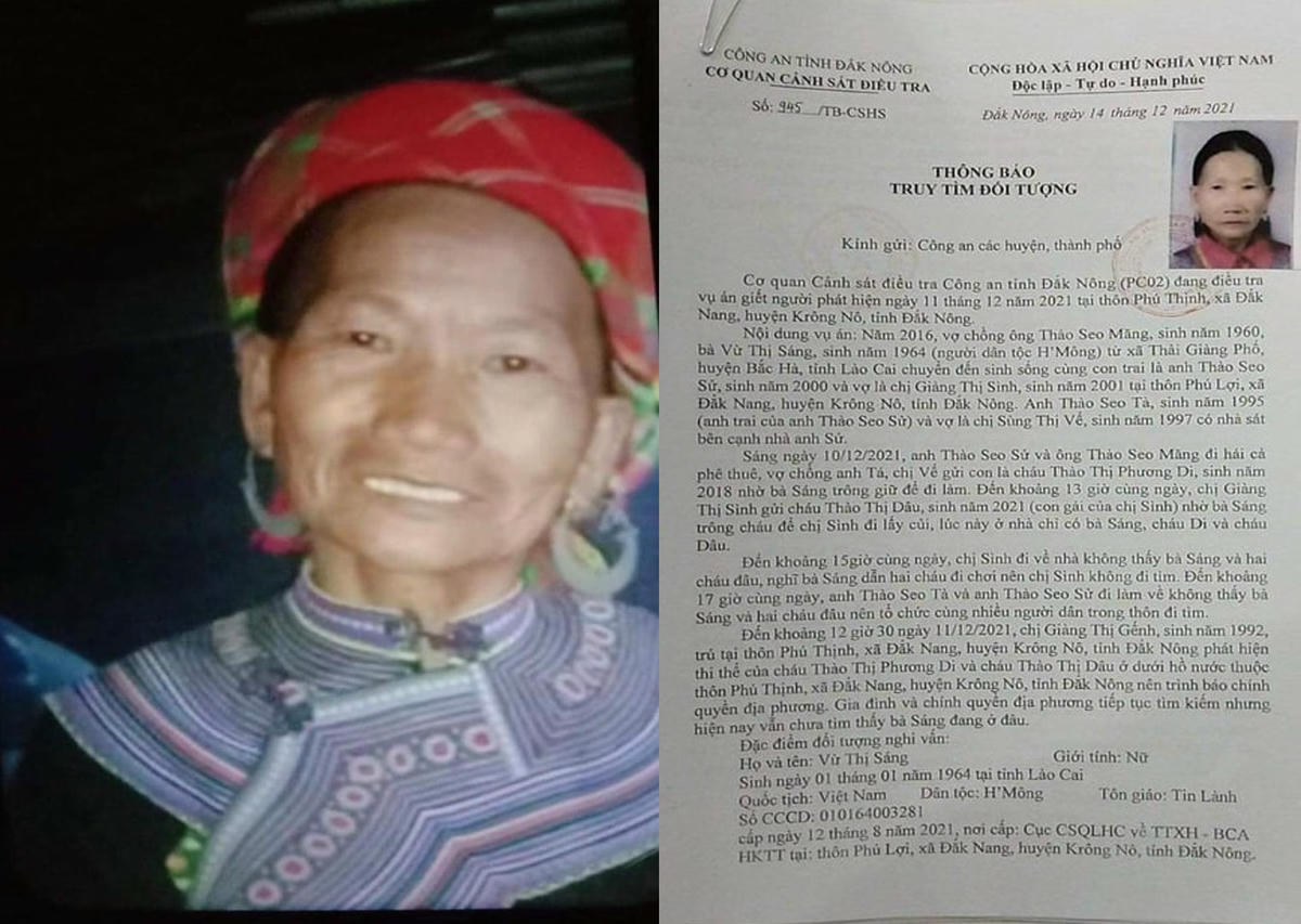 Chiều 7/1, một nguồn tin cho biết, người dân địa phương vừa phát hiện thi thể bà Vừ Thị Sáng (57 tuổi, dân tộc Mông, trú tại xã Đắk Nang, huyện Krông Nô, Đắk Nông), nghi can liên quan đến vụ án mạng 2 cháu nhỏ tử vong ở hồ nước.