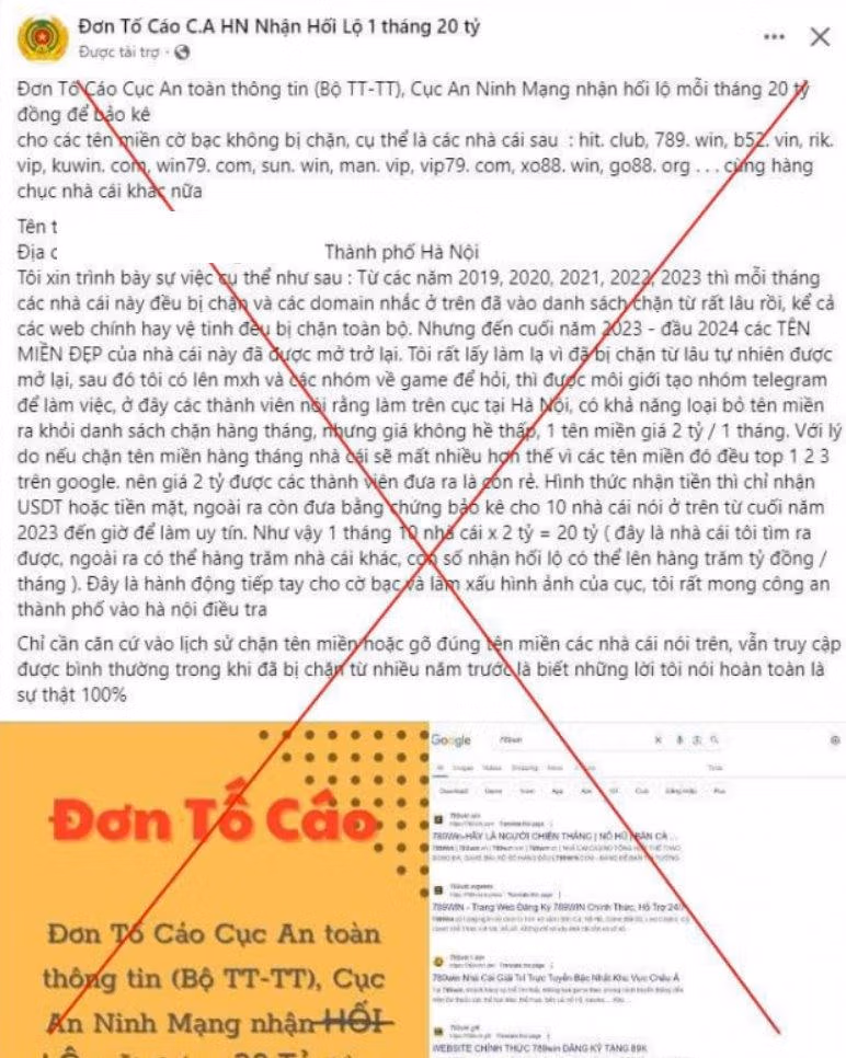 "Một số đối tượng còn phát tán đơn tố cáo sai sự thật về công tác đấu tranh, xử lý các trang mạng, đường dây tổ chức đánh bạc của cơ quan chức năng. Đây thực chất là thông tin xấu độc, sai sự thật nhằm thu hút dư luận xã hội, công kích, hạ uy tín các đơn vị chức năng để nhằm mục đích quảng cáo về các trang mạng, đường dây đánh bạc”, A05 cho biết.