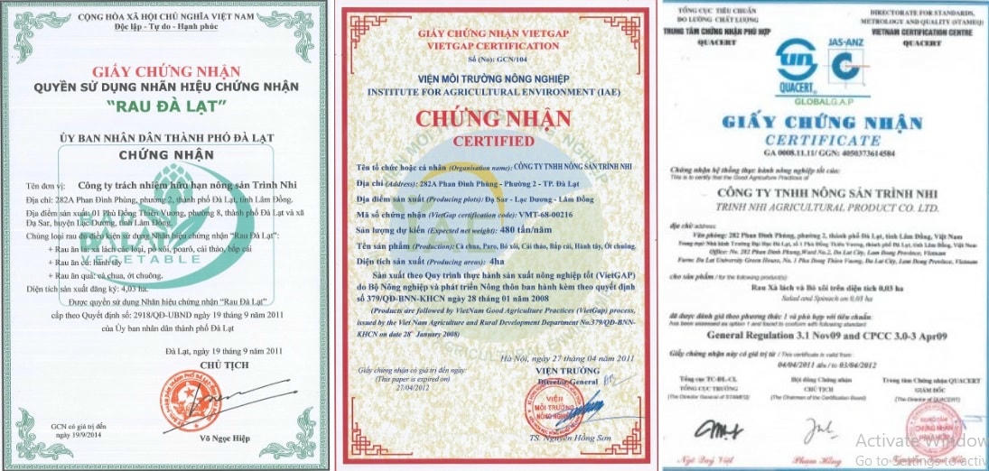 Công ty cũng được cấp giấy chứng nhận Global Gap trên diện tích 0,3 ha để làm mô hình trình diễn cho các hộ nông dân tham khảo và được UBND TP Đà Lạt cấp giấy chứng nhận quyền sử dụng nhãn hiệu rau Đà Lạt. Ngoài ra, công ty cũng được cấp hệ thống quản lý chất lượng ISO 22000 : 2005.