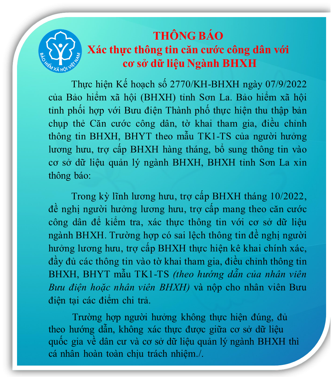 Cụ thể, thực hiện Kế hoạch số 2770/KH-BHXH ngày 07/9/2022 của Bảo hiểm xã hội (BHXH) tỉnh Sơn La, BHXH tỉnh phối hợp với Bưu điện Thành phố Sơn La thực hiện thu thập bản chụp thẻ Căn cước công dân, tờ khai tham gia, điều chỉnh thông tin BHXH, BHYT theo mẫu TK1-TS của người hưởng, bổ sung thông tin vào cơ sở dữ liệu quản lý ngành BHXH, BHXH tỉnh Sơn La xin thông báo: