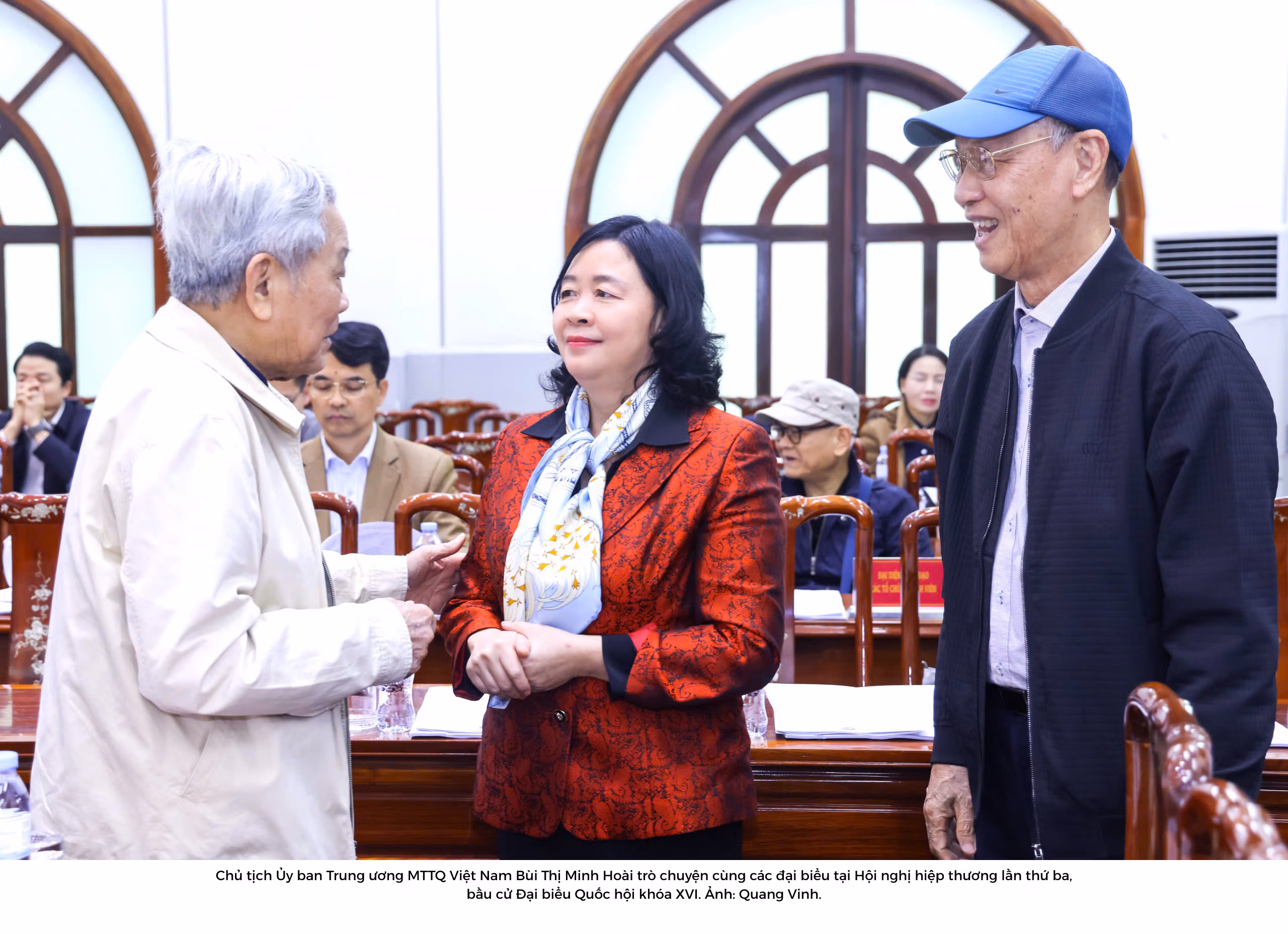 - Chủ tịch Bùi Thị Minh Hoài: Có thể khẳng định, năm 2025 là một dấu mốc đặc biệt, một "cuộc cách mạng" về tổ chức bộ máy của hệ thống Mặt trận. Việc thực hiện sắp xếp, tinh gọn các tổ chức chính trị - xã hội về dưới "mái nhà chung" Mặt trận không đơn thuần là một giải pháp cơ học nhằm giảm bớt đầu mối hành chính hay tinh giản biên chế, mà đây là quyết tâm chính trị cao nhất, là bước đi chiến lược nhằm hiện thực hóa quan điểm chỉ đạo của Ban Chấp hành Trung ương, Bộ Chính trị, Ban Bí thư, đứng đầu là đồng chí Tổng Bí thư về một hệ thống chính trị tinh gọn, hoạt động hiệu lực, hiệu quả, đáp ứng yêu cầu cấp thiết để đất nước vững bước vào kỷ nguyên mới - kỷ nguyên vươn mình của dân tộc Việt Nam.