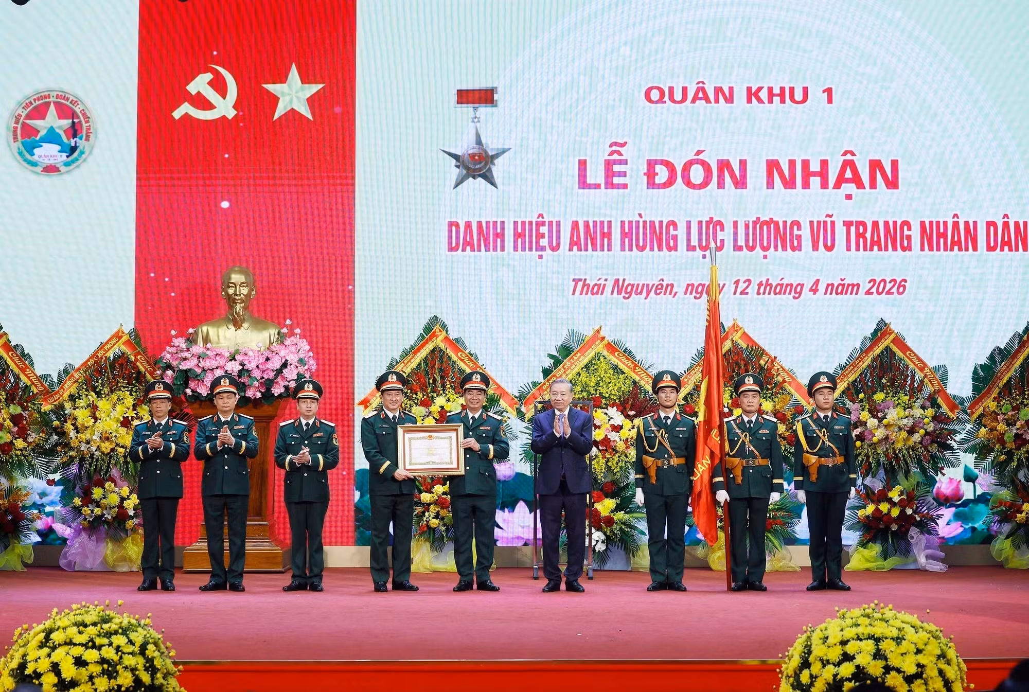 Sáng 12/4, tại Thái Nguyên, Đảng ủy, Bộ Tư lệnh Quân khu 1, Bộ Quốc phòng tổ chức lễ đón nhận danh hiệu Anh hùng Lực lượng vũ trang nhân dân. Tổng Bí thư, Chủ tịch nước Tô Lâm, Bí thư Quân ủy Trung ương, dự và phát biểu chỉ đạo.