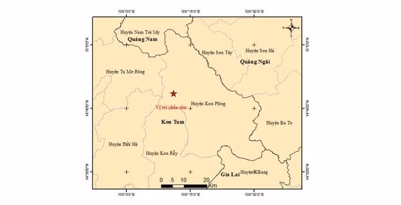 Trận động đất có độ lớn 3,6 xảy ra tại khu vực huyện Kon Plông, tỉnh Kon Tum vào khoảng 15 giờ 21 phút 45 giây, ngày 14/7.