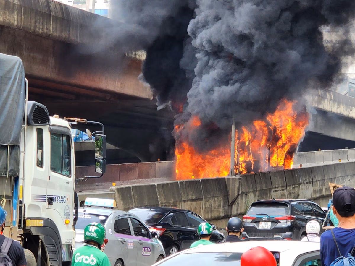 Tại hiện trường, chiếc xe khách bốc cháy hoàn toàn, cột khói từ vụ cháy bốc cao hàng chục mét. Vụ việc khiến giao thông qua lại đường Vành đai 3 trên cao và đường Khuất Duy Tiến (hướng Thanh Trì) bị ùn ứ.