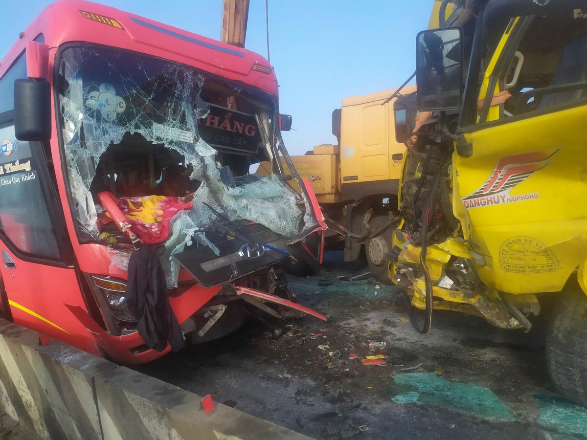 Cú tông mạnh cũng đã khiến đầu xe tải và xe khách bẹp dúm, hành khách trên xe ô tô giường nằm một phen hoảng hốt.