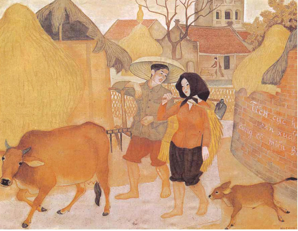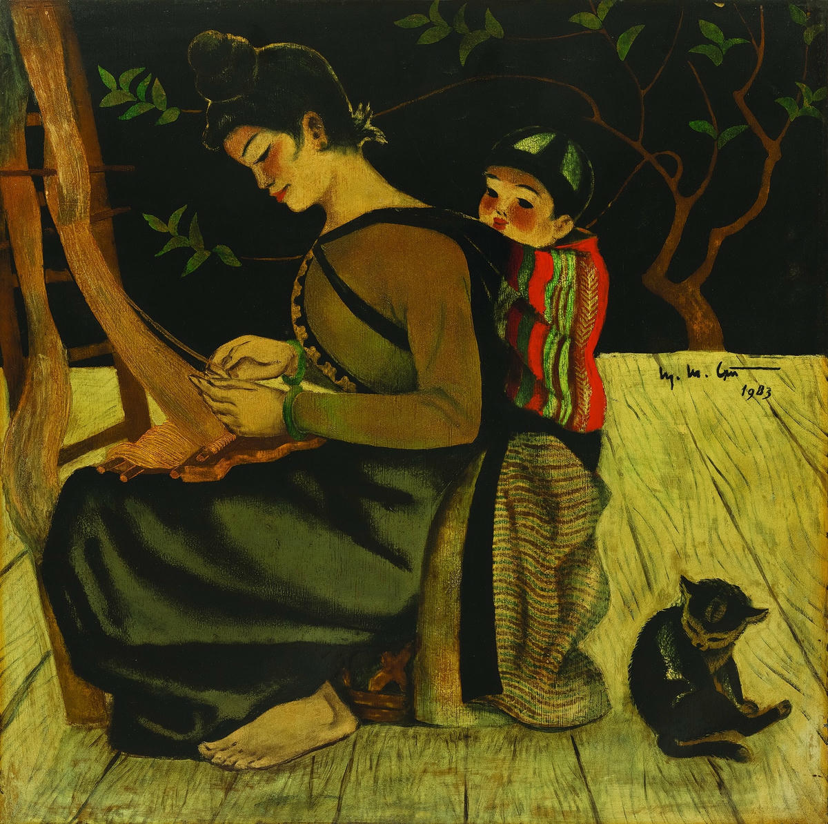 Nhưng hôm nay thấy mảng sơn mài phong phú và đầy hơi thở vùng núi Tây Bắc cách đây hàng nửa thế kỷ. Anh Đức, người sưu tập một số tranh ông cho biết, ông cẩn thận, tự tay làm vóc sơn mài. Hẳn nào mà có bức “Tuổi áo trắng” (120x486cm), ghép 6 tấm vóc. Nếu không tự tay làm vóc thì chẳng thể tìm đâu ra! Tôi nhớ thời ấy, tấm vóc 120x180cm chỉ nằm trong mơ ước của một vài cao thủ sơn mài, mà vẫn không có được!