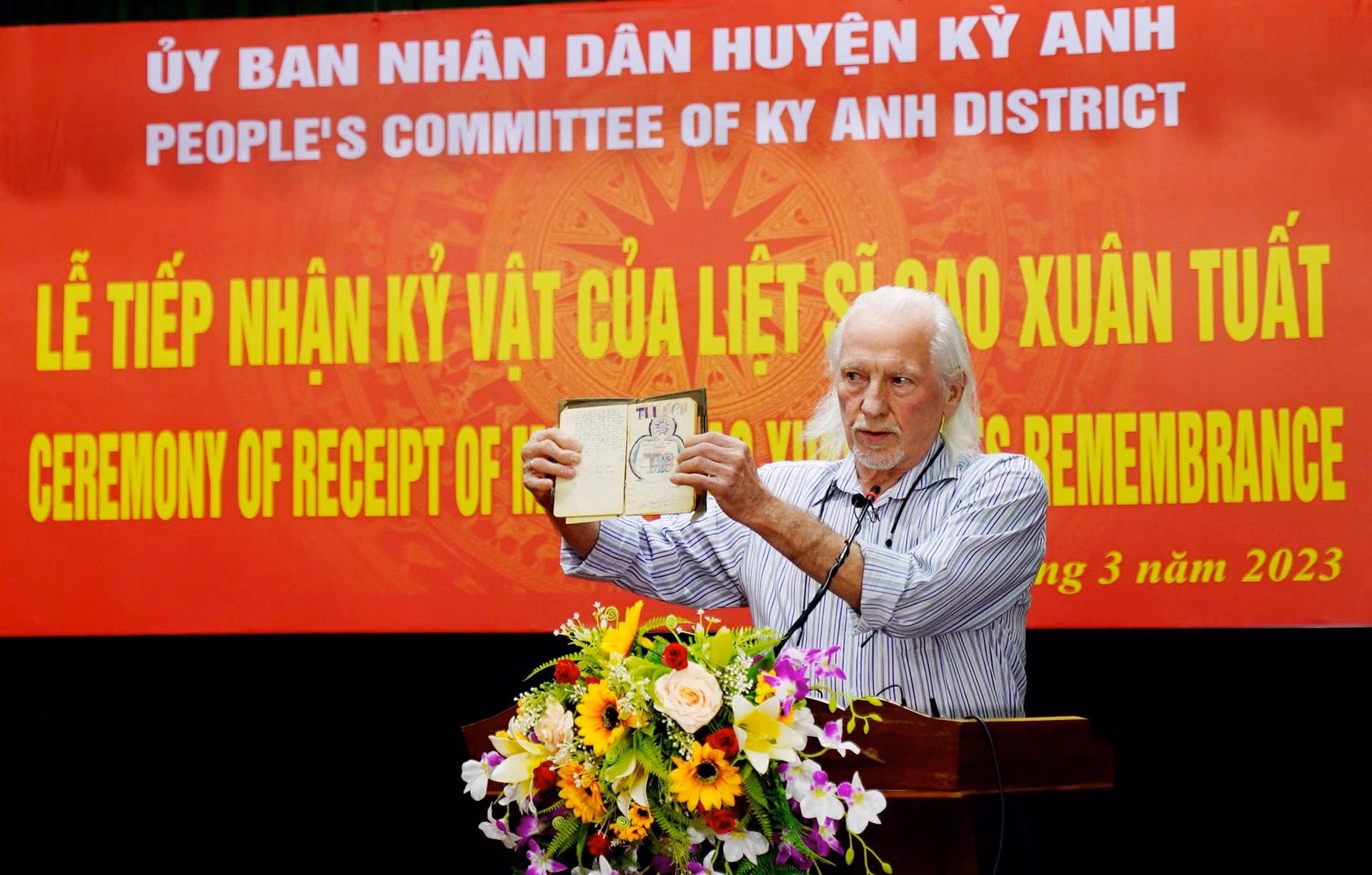 Sáng 5/3, UBND huyện Kỳ Anh (Hà Tĩnh) tổ chức Lễ tiếp nhận kỷ vật của liệt sĩ Cao Xuân Tuất. Cuốn nhật ký do cựu binh Mỹ Peter Mathews lưu giữ 56 năm bên mình.