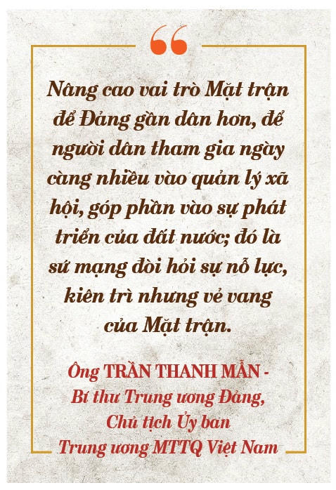 Đảng đang đặt niềm tin vào Mặt trận. Mặt trận chính là cầu nối vững chắc để thắt chặt mối quan hệ máu thịt Đảng, Nhà nước, Nhân dân. Đảng làm cho dân, và dân làm theo Đảng. Nâng cao vai trò Mặt trận để Đảng gần dân hơn, để người dân tham gia ngày càng nhiều vào quản lý xã hội, góp phần vào sự phát triển của đất nước; đó là sứ mạng đòi hỏi sự nỗ lực, kiên trì nhưng vẻ vang của Mặt trận.