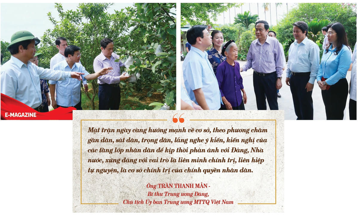 Mặt trận ngày càng hướng mạnh về cơ sở, theo phương châm gần dân, sát dân, trọng dân, lắng nghe ý kiến, kiến nghị của các tầng lớp nhân dân để kịp thời phản ánh với Đảng, Nhà nước, xứng đáng với vai trò là liên minh chính trị, liên hiệp tự nguyện, là cơ sở chính trị của chính quyền nhân dân.