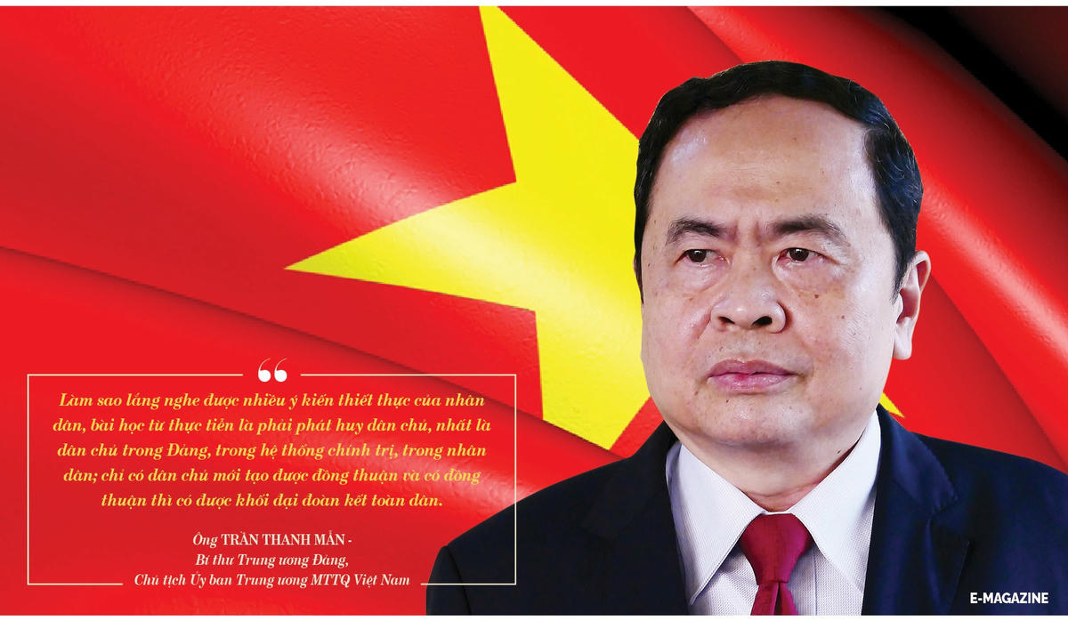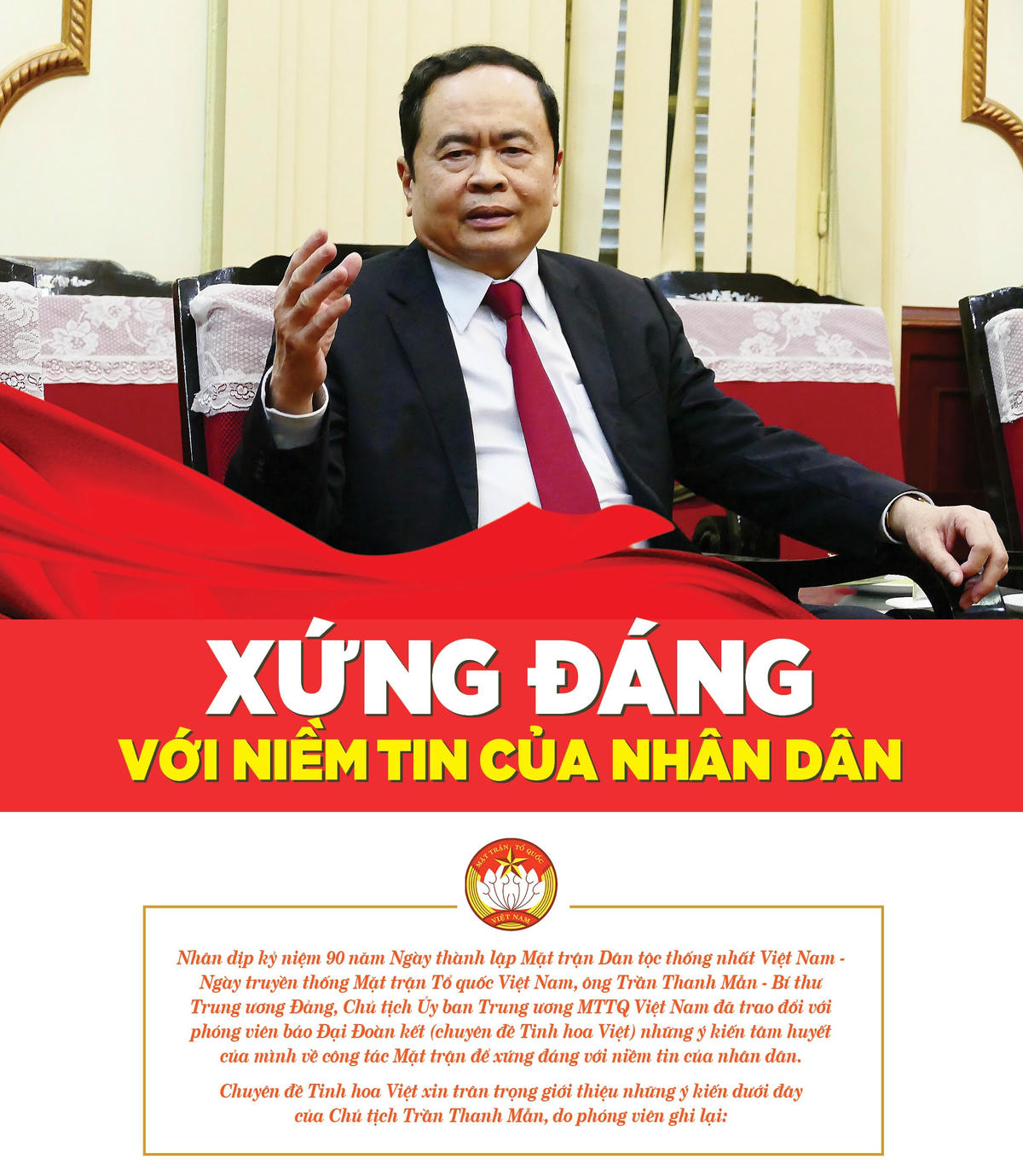 Nhân dịp kỷ niệm 90 năm Ngày thành lập Mặt trận Dân tộc thống nhất Việt Nam - Ngày truyền thống Mặt trận Tổ quốc Việt Nam, ông Trần Thanh Mẫn – Bí thư Trung ương Đảng, Chủ tịch Ủy ban Trung ương MTTQ Việt Nam đã trao đổi với phóng viên báo Đại Đoàn kết (chuyên đề Tinh hoa Việt) những ý kiến tâm huyết của mình về công tác Mặt trận để xứng đáng với niềm tin của nhân dân.