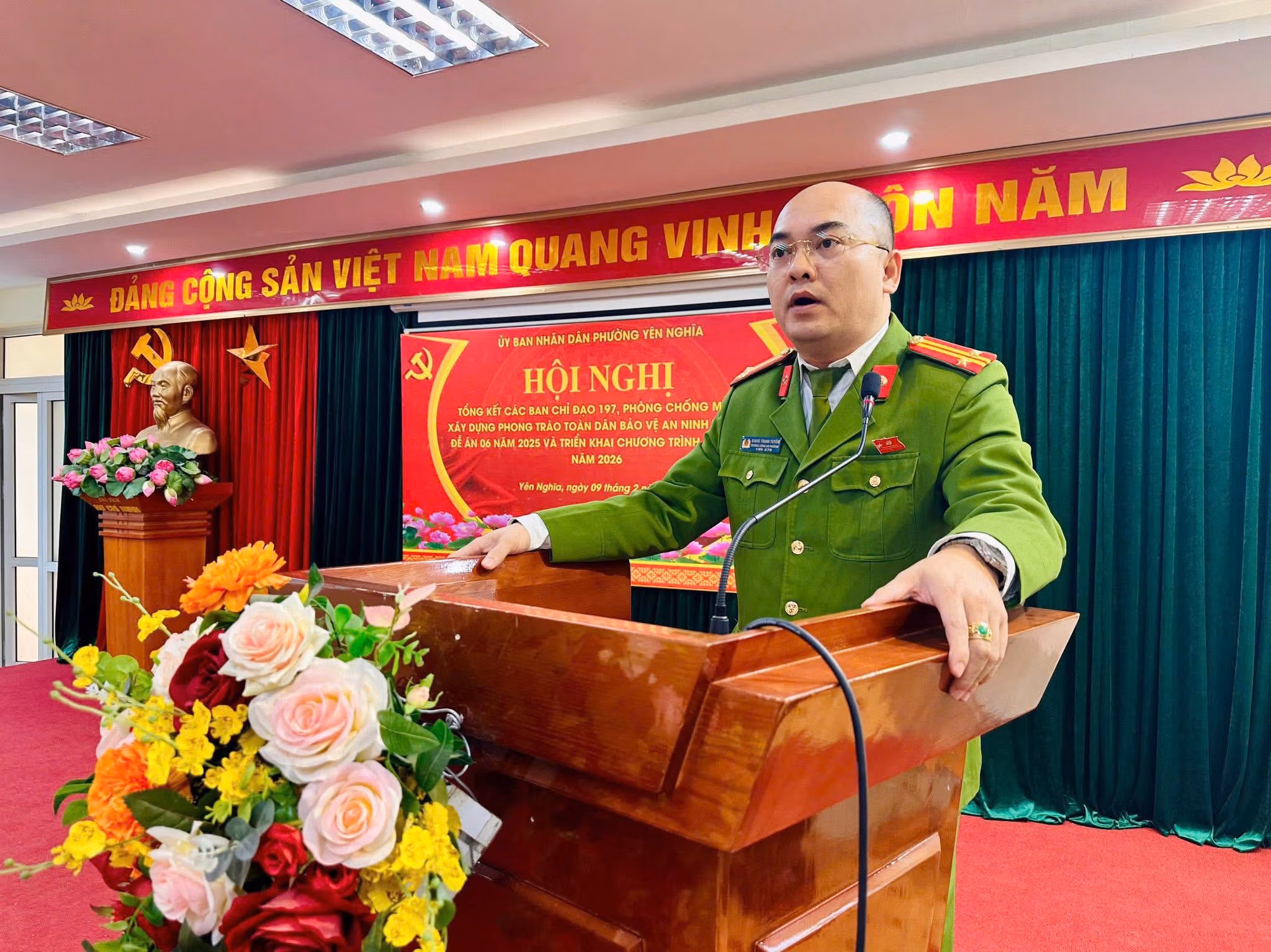 Đánh giá kết quả đạt được tại Hội nghị tổng kết công tác năm 2025 và triển khai nhiệm vụ trọng tâm năm 2026 của các Ban Chỉ đạo 197, Phòng chống ma túy, Đề án 06 và phong trào toàn dân bảo vệ an ninh Tổ quốc mới đây, Trung tá Giang Thanh Tuyên - Trưởng Công an phường Yên Nghĩa cho biết, năm 2025 diễn ra trong bối cảnh tình hình an ninh trật tự còn tiềm ẩn nhiều yếu tố phức tạp, song lực lượng Công an phường đã chủ động tham mưu, triển khai đồng bộ các giải pháp và đạt nhiều kết quả tích cực. Nổi bật là việc triển khai hiệu quả mô hình "phường, tổ dân phố không ma túy", góp phần phòng ngừa tội phạm từ sớm, từ xa. Công tác đảm bảo an ninh, an toàn cho các sự kiện chính trị lớn, đặc biệt là Lễ kỷ niệm 80 năm Cách mạng Tháng Tám được thực hiện nghiêm túc, tuyệt đối không để xảy ra bị động, bất ngờ.