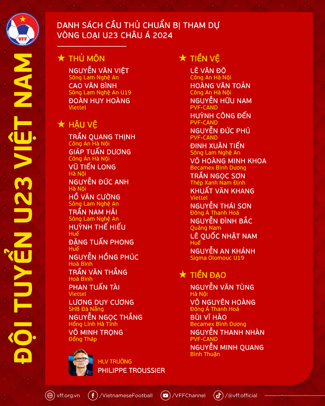 Theo tin từ Liên đoàn bóng đá Việt Nam tối 27/8, ngay sau khi đội tuyển U23 Việt Nam do HLV Hoàng Anh Tuấn dẫn dắt hoàn thành thi đấu tại giải vô địch U23 Đông Nam Á 2023 và trở về nước, HLV Philippe Troussier đã chính thức công bố danh sách tập trung đội tuyển U23 Việt Nam đợt thứ hai trong kế hoạch chuẩn bị cho Vòng loại U23 châu Á 2024.