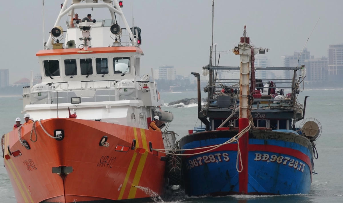 Tàu cá BĐ 96728 TS cùng 13 ngư dân tỉnh Bình Định gặp nạn trên biển đã được tàu cứu nạn SAR 412 của Trung tâm phối hợp tìm kiếm cứu nạn hàng hải khu vực 2 (Danang MRCC) ứng cứu, lai dắt về Đà Nẵng an toàn.