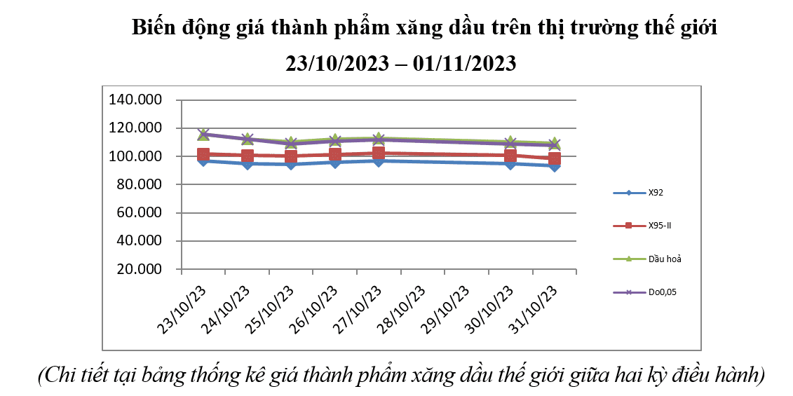 Theo thông tin từ Bộ Công Thương, thị trường xăng dầu thế giới kỳ điều hành lần này (từ ngày 23/10/2023 - 1/11/2023) chịu ảnh hưởng của các yếu tố như: Khả năng gián đoạn nguồn cung từ cuộc xung đột ở Trung Đông không cao và việc tăng sản lượng từ Mỹ và OPEC khiến giá xăng dầu từ ngày 23/10 đến 1/11 có biến động tăng giảm đan xen.