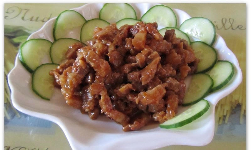 Bước 4: Dọn thịt xào mắm ruốc ra ăn cùng với cơm và dưa leo.