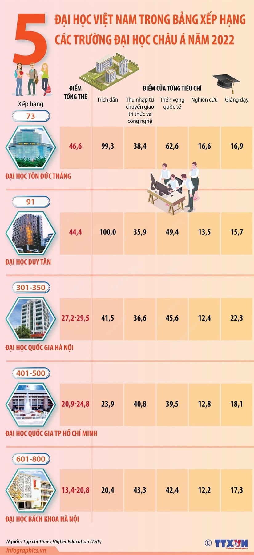 Trong bảng xếp hạng các trường đại học châu Á năm 2022, Việt Nam có 5 đại diện gồm Đại học Tôn Đức Thắng, Duy Tân, Đại học Quốc gia Hà Nội, Đại học Quốc gia TP HCM và Đại học Bách khoa Hà Nội.