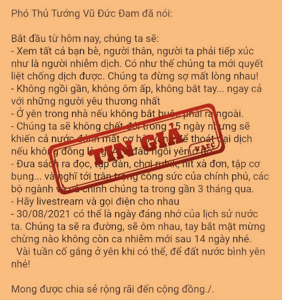 '7 lời khuyên chống dịch của Phó Thủ tướng Vũ Đức Đam' là giả mạo