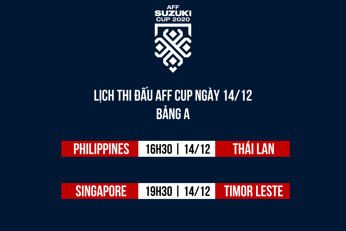 Theo lịch thi đấu AFF Cup 2020 hôm nay (14/12), Thái Lan sẽ gặp Philippines lúc 16h30 và Singapore sẽ chạm trán Timor Leste lúc 19h30, trong khi Myanmar là đội được nghỉ lượt trận này tại bảng A.