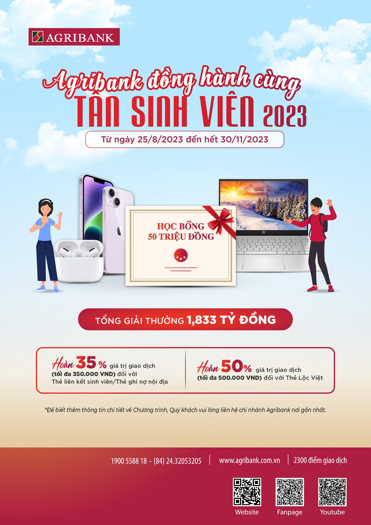 Để chào đón tân sinh viên năm học 2023-2024 tại tất cả các trường đại học, cao đẳng trên cả nước, Agribank triển khai chương trình khuyến mại “Agribank đồng hành cùng Tân sinh viên năm 2023” với tổng giá trị giải thưởng lên đến hơn 1,8 tỷ đồng.