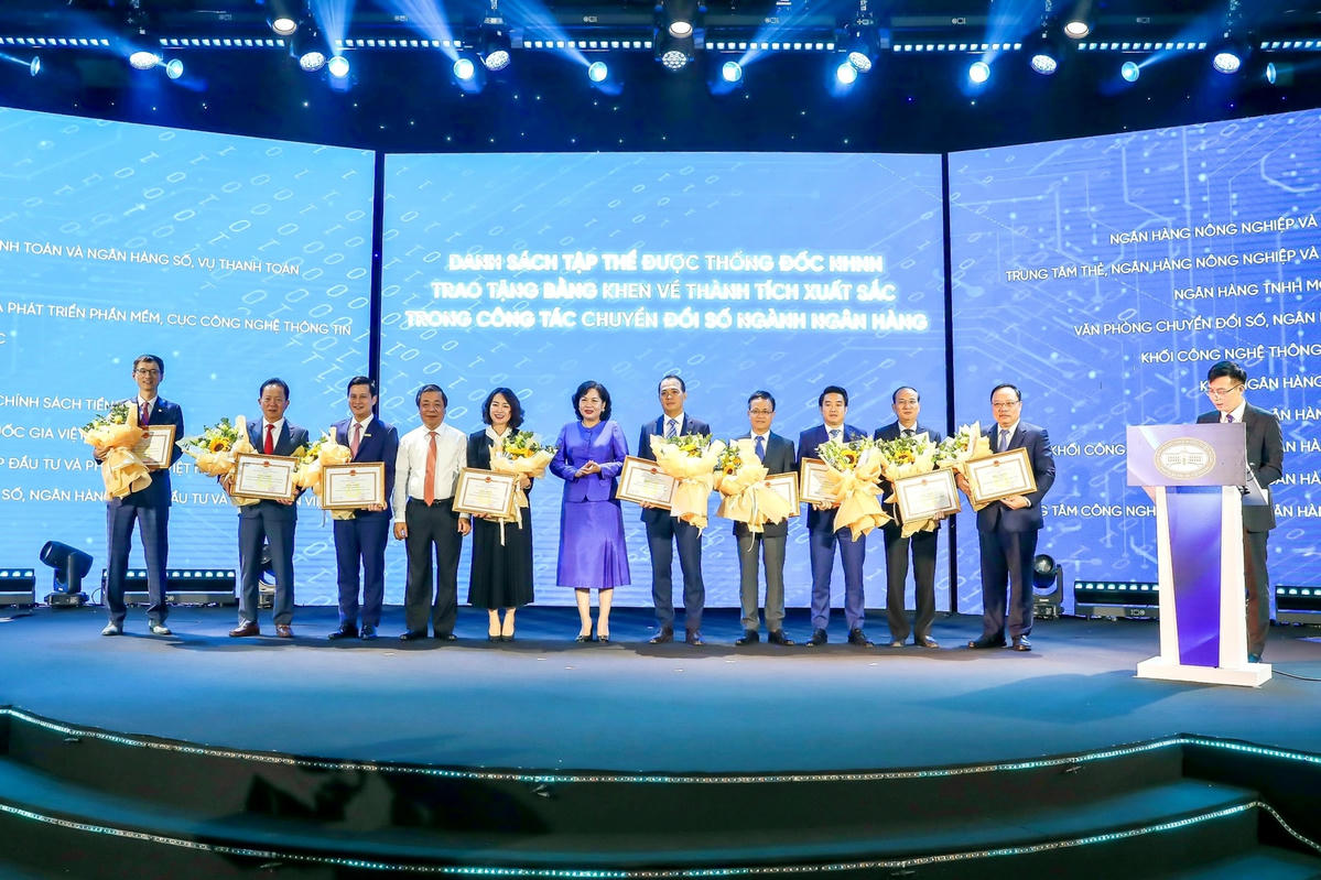 Ông Tô Đình Tơn, Phó Tổng giám đốc Agribank (thứ 2 từ trái qua) nhận Bằng khen của Thống đốc NHNN.Tại sự kiện Ngày chuyển đổi số ngành Ngân hàng năm 2023, Agribank đã vinh dự được nhận Bằng khen của Thống đốc Ngân hàng Nhà nước Việt Nam về thành tích xuất sắc đột xuất trong công tác chuyển đổi số ngành ngân hàng.
