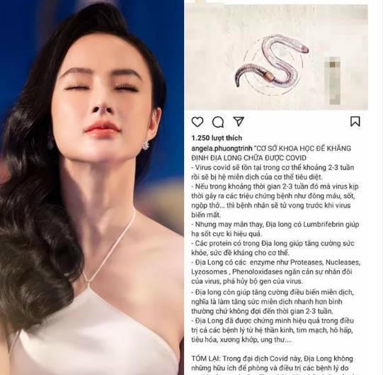 Trước đó, vào tháng 8/2021, Angela Phương Trinh nhiều lần chia sẻ các bài viết liên quan việc “nuốt giun đất sống trị Covid-19”.